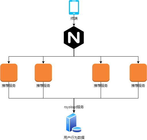 网上有一篇 博文是介绍将 rsyslog 的日志输出到 mysql 中,当然强大的 rsyslog 不仅支持输出到 mysql 中,基本覆盖了所有的主流存储软件。 不过这里介绍的实战是利用 rsyslog 的用户自定义设备来实现推荐系统的用户行为收集。大体的思路是推荐请求或数据上报请求通过 nginx 将请求转发到多台 online 服务中的一个。 该服务处理完请求后会将推荐的数据或打点上报的数据通过 SyslogHandler 汇总到目标服务器上进行推荐系统用户行为的统一处理。具体架构见下图: