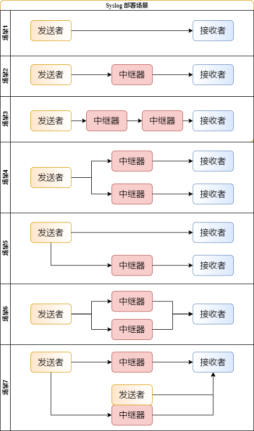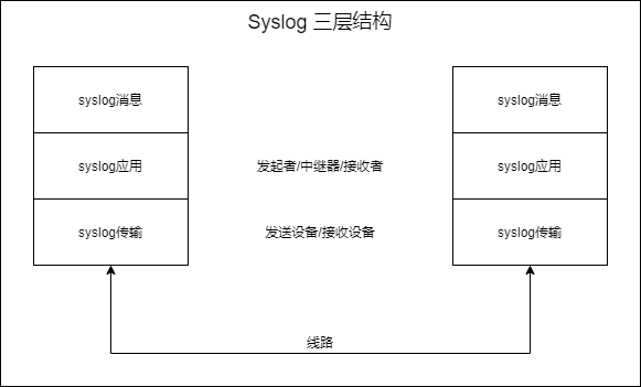 Syslog 协议使用三层结构,第一层是消息层,指要传输的信息;第二层是应用层,主要用于消息的生成,解析,路由和存储,代表有发送者,中继器和接受者。第三层是传输层,主要用于发送和接收网络上的信息,代表有发送设备和接收设备。 具体的层次结构见下图(这块的理解可以参考 OSI 7层模型或 TCP/IP 4层模型):