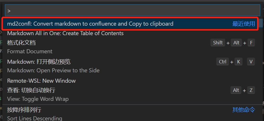 Shift+Command+P),输入md2confl, 该操作会将当前 Markdown 文档转换成 Confluence,并且复制到剪贴板 - 将剪贴板的内容粘贴到 Confluence 页面中