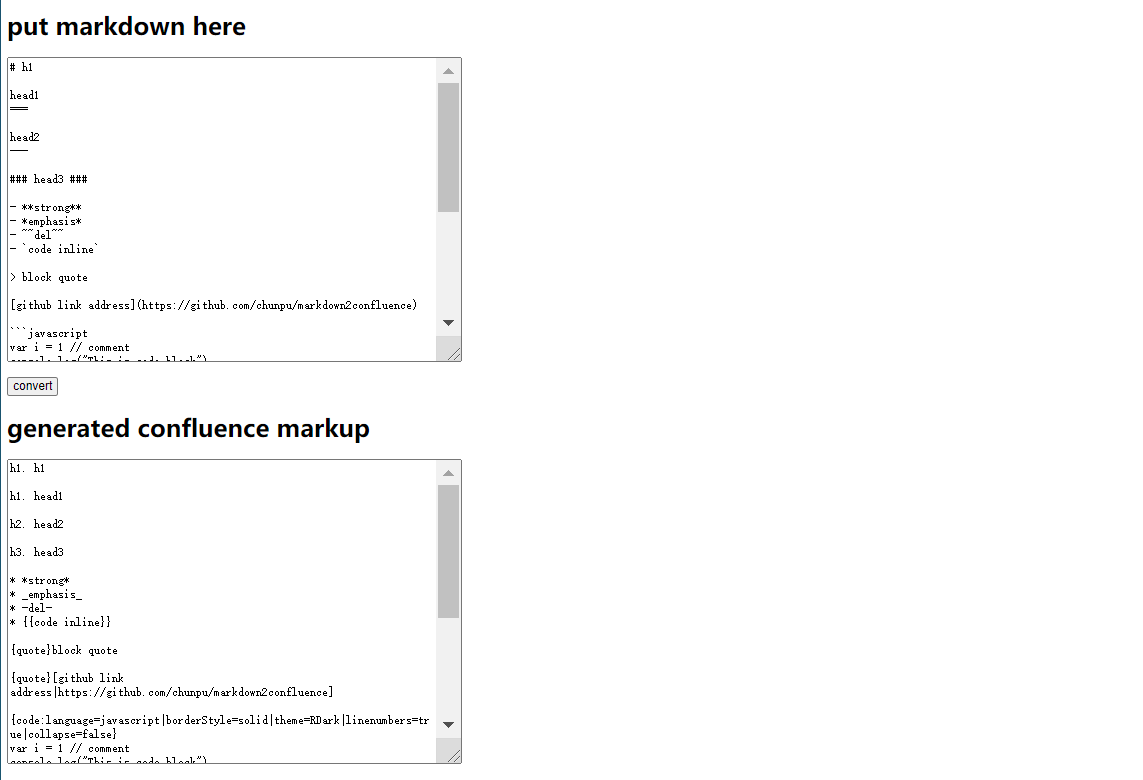 很多公司使用 Confluence 来构建企业的知识管理系统, 但是不得不说,文档的构建对程序员很不友好。对于用惯了 Markdown 这种轻量级标记语言的程序员来说,写文章半小时,排版半小时。于是乎就有了这篇将 Markdown 转换为 Confluence 格式文档的技巧文档。