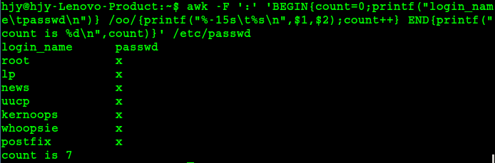 1awk -F ':' 'BEGIN{count=0;printf("login_name\tpasswd\n")} /oo/{printf("%-15s\t%s\n",$1,$2);count++} END{printf("count is %d\n",count)}' /etc/passwd注意: BEGIN{} 表示在处理任意行之前进行的操作. END{} 表示在处理完所有行之后进行的操作.
