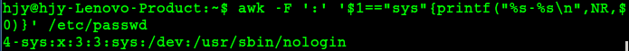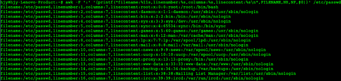 1awk -F ':' '{printf("filename:%11s,linenumber:%s,columns:%s,linecontent:%s\n",FILENAME,NR,NF,$0)}' /etc/passwd -