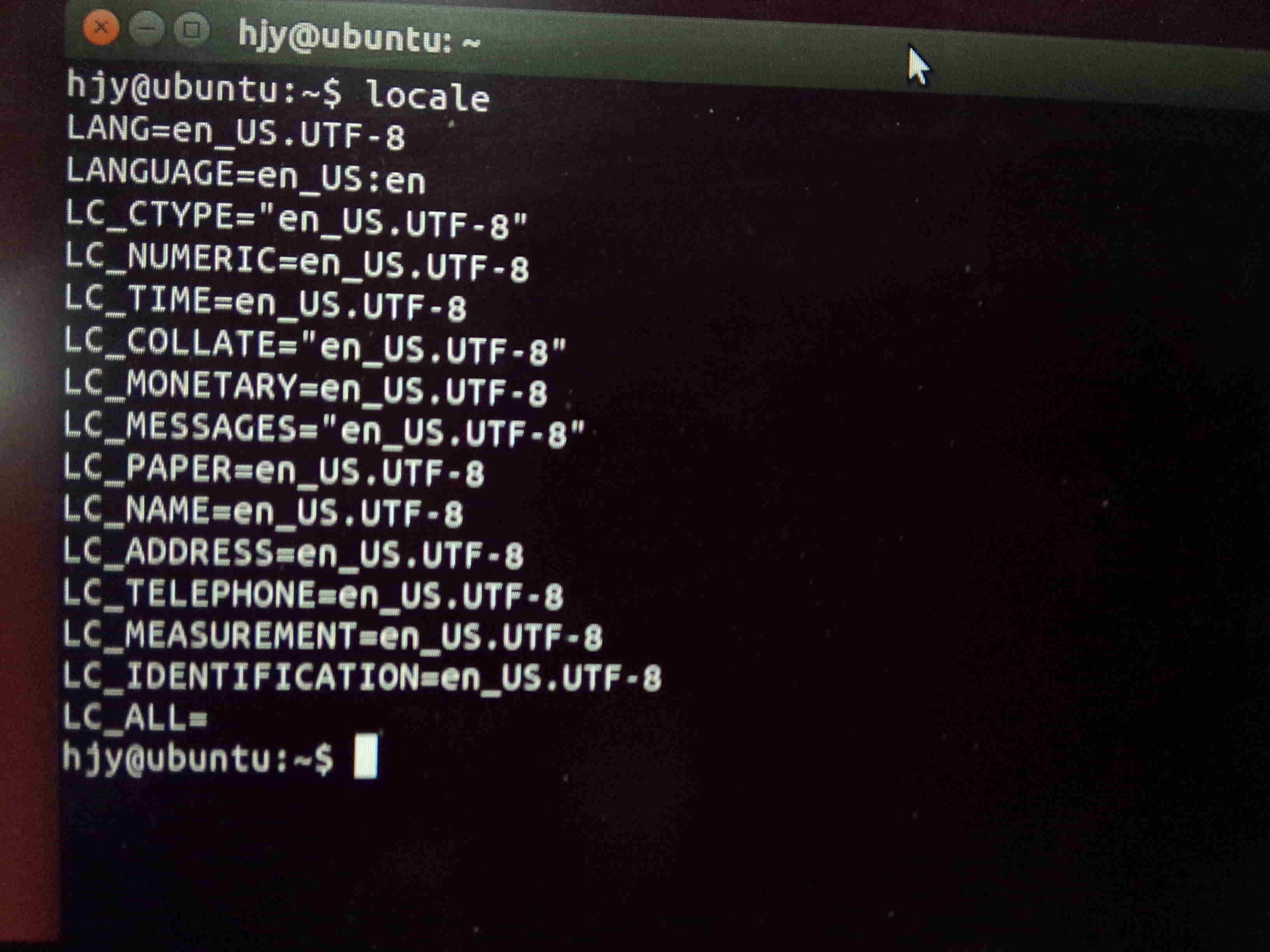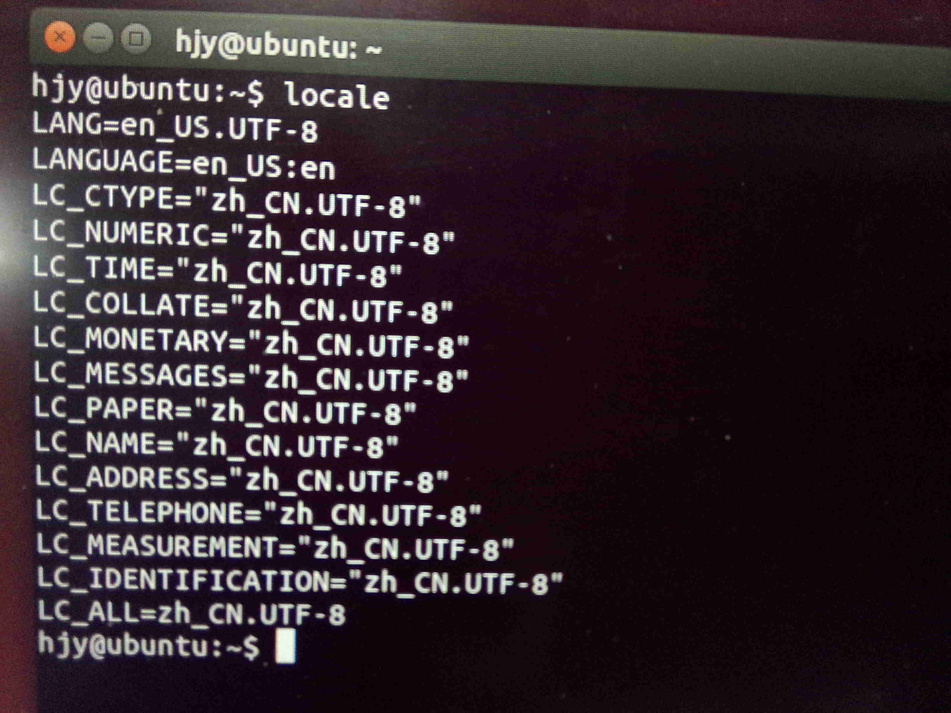 export LC_ALL=zh_CN.UTF-8,并将其加入到 /etc/envirionment,退出系统重新登录,登录界面和locale变量如下图所示: