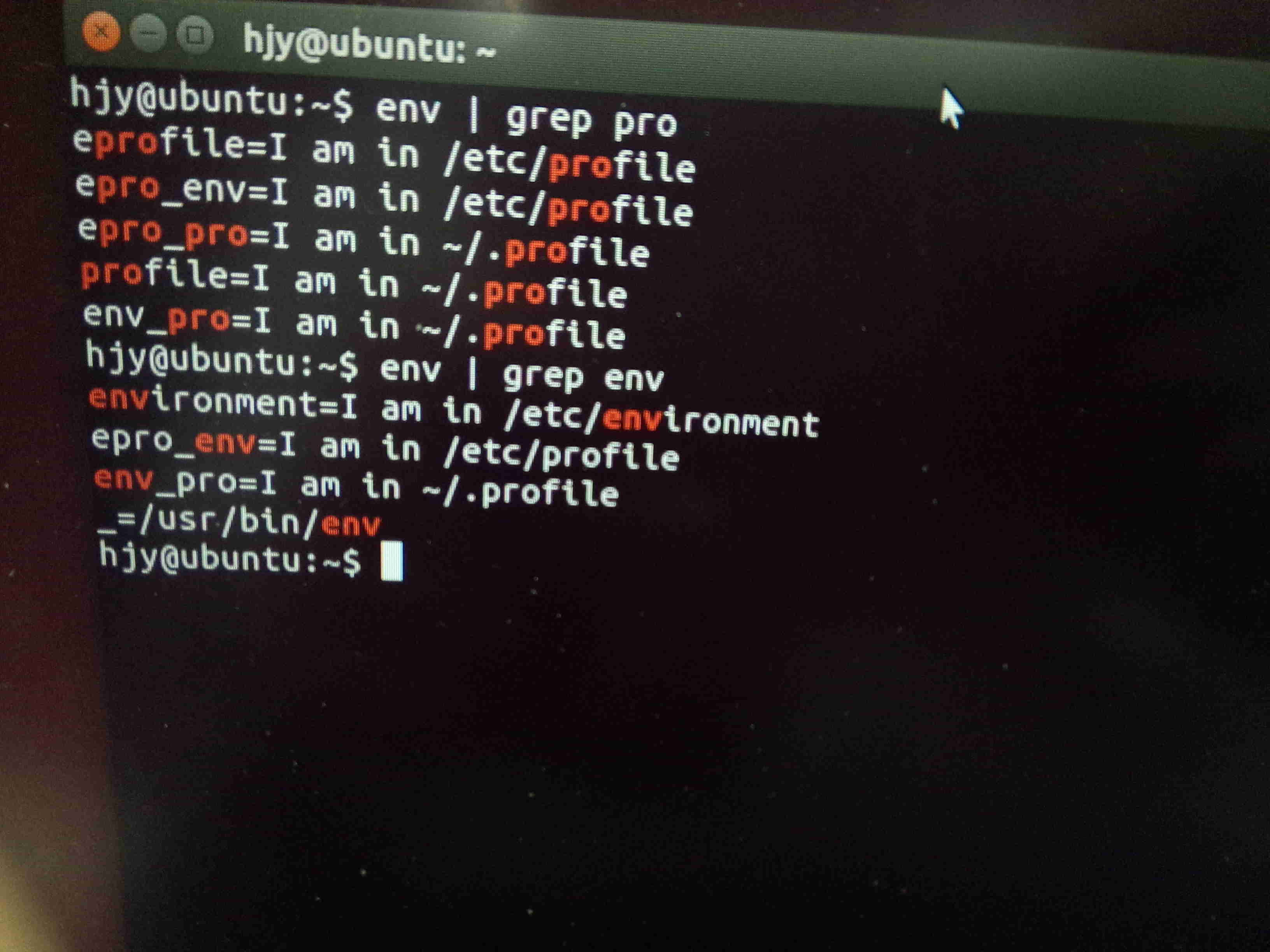 1export profile='I am in ~/.profile' 2export epro_pro='I am in ~/.profile' 3export env_pro='I am in ~/.profile' -
