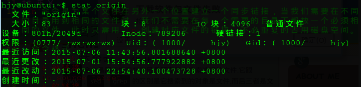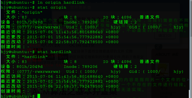 注意 Inode 和硬链接,下面创建 origin 的硬链接 hardlink。