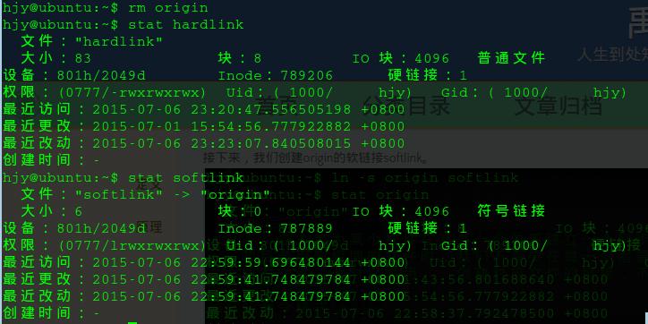 比对发现,创建硬链接的文件 hardlink 与原文件 origin 之间除了名称不同之外其他完全相同,就像同一个人它有个正式的名称也可能会有小名。它们的数据显然完全一样。