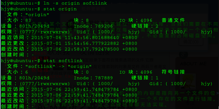 对比发现,origin 和 softlink 是完全不同的文件,有着不同的 size,不同的块,不同的 Inode,不同的 type。唯一的联系是 softlink 文件指向 origin 文件(有点文件指针的味道)。