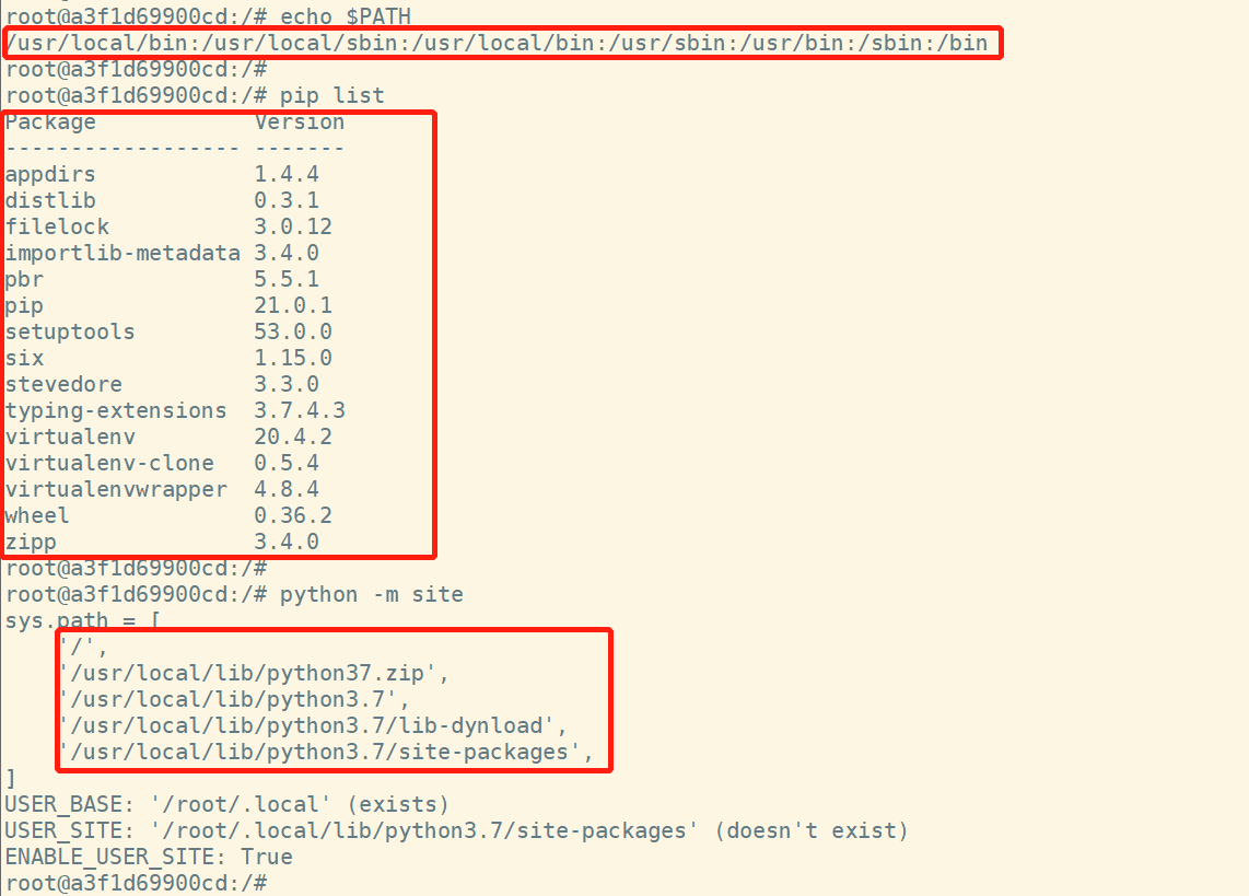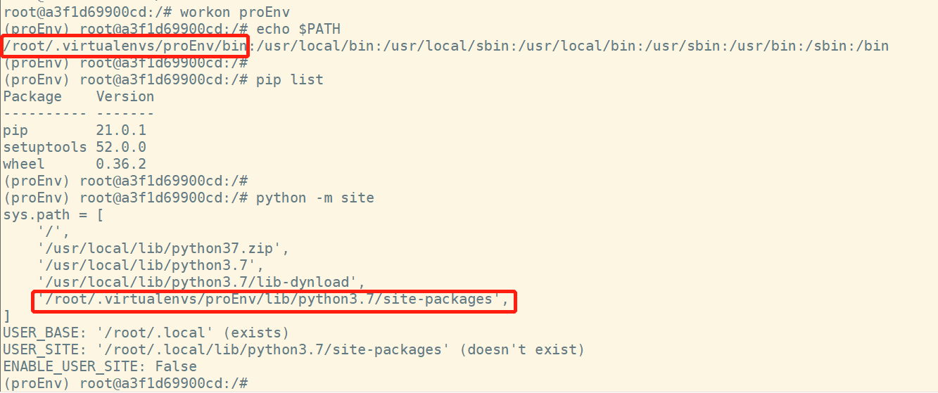 对比 python -m site 的结果,发现虚拟环境的 sys.path 中第三方依赖库的目录由 /usr/local/lib/python3.7/site-packages 换成了 /root/.virtualenvs/proEnv/lib/python3.7/site-packages。这就是为什么 pip list 看不见什么软件包的原因,也是环境隔离的最大秘密。