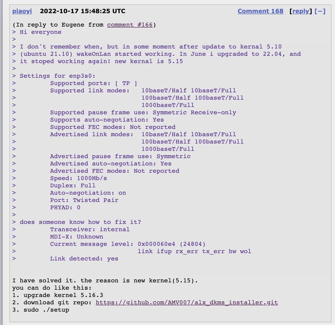从这个 帖子 我们知道,网卡 Killer E2500 Gigabit 的驱动是 alx,但是该驱动默认是关闭远程唤醒功能的。如果想要开启该功能需要内核支持。看遍了该帖子发现对于最新的 Ubuntu 22.04 LTS(内核 5.15) 并没有直接的解决方案。但是发现对于内核 5.16.3 有了 alx 补丁,所以有了如下的升级内核的解决方案。