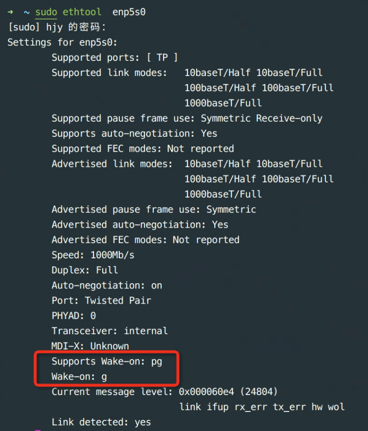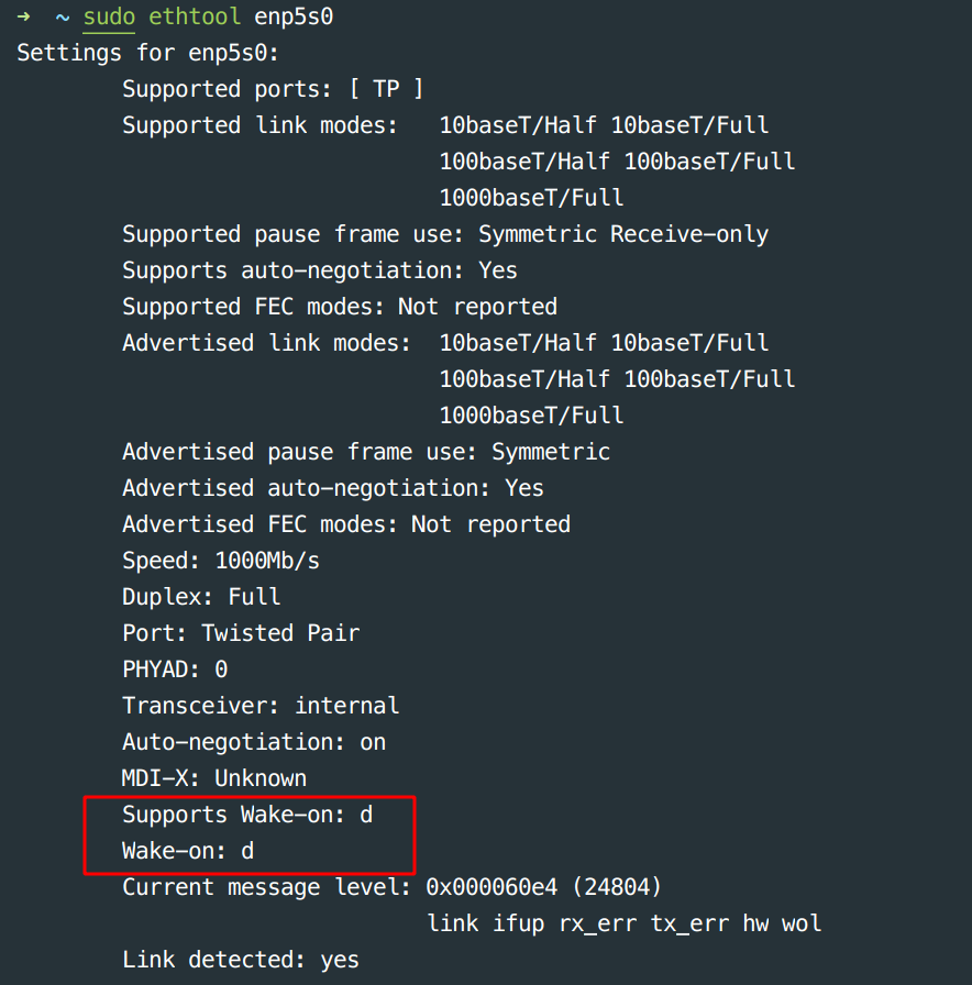 3# 验证当前网卡 enp5s0 是否开启 wol 支持